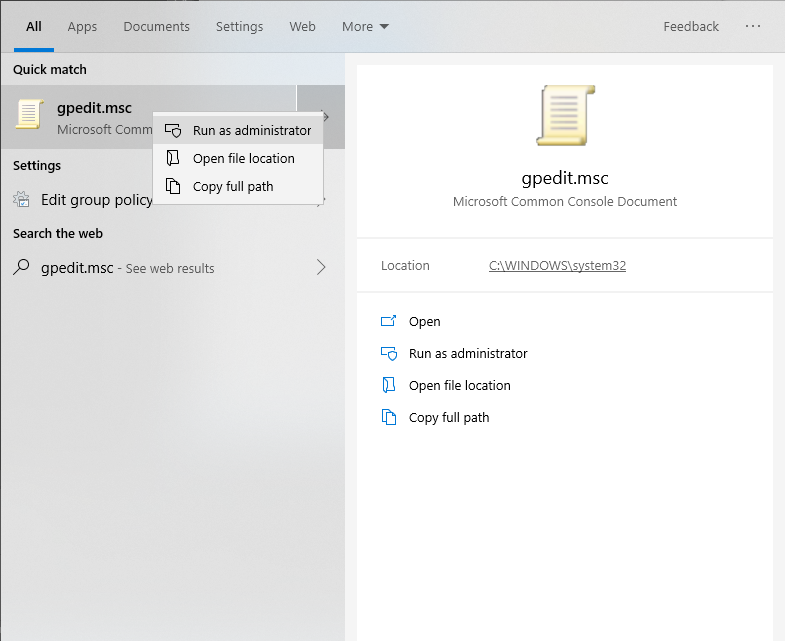 In your search bar, type gpedit.msc. Extra step if you’re not logged in to Windows as an admin user: right-click and select Run as Administrator. Enter your credentials.