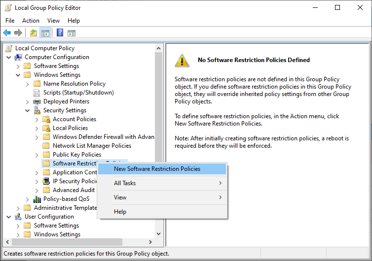 Navigate down the tree of options: Computer Configuration → Windows Settings → Security Settings → Software Restriction Policies. Right-click and select New Software Restriction Policies.