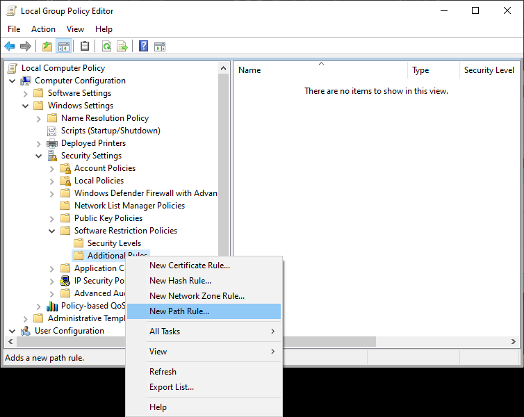 From the newly created sub-options, right-click Additional Rules and select New Path Rule.
